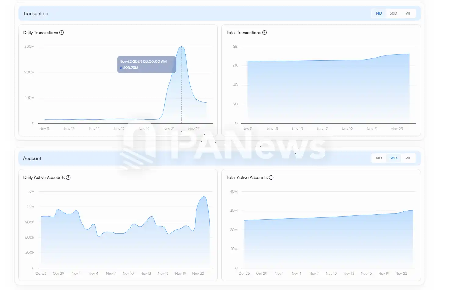 Sui 在增长方面似乎能跟上 Solana 的节奏,每日活跃地址 11 月 5 日为 61.7 万个,到 11 月 23 日则突破了 140 万,增长也在 1 倍以上。而 Sui 网络不知是否再一次迎来垃圾邮件的突袭,11 月 22 日网络交易笔数超过了 2.98 亿笔,还造成了短暂的网络中断。这一数据不仅较之前日均的 1500 万笔提升了 20 倍,更是打破了所有区块链网络的单日交易笔数记录。只不过这种突然暴增的数据已经数次发生在 Sui 上,因此加密社区似乎对此并没有太多惊奇。