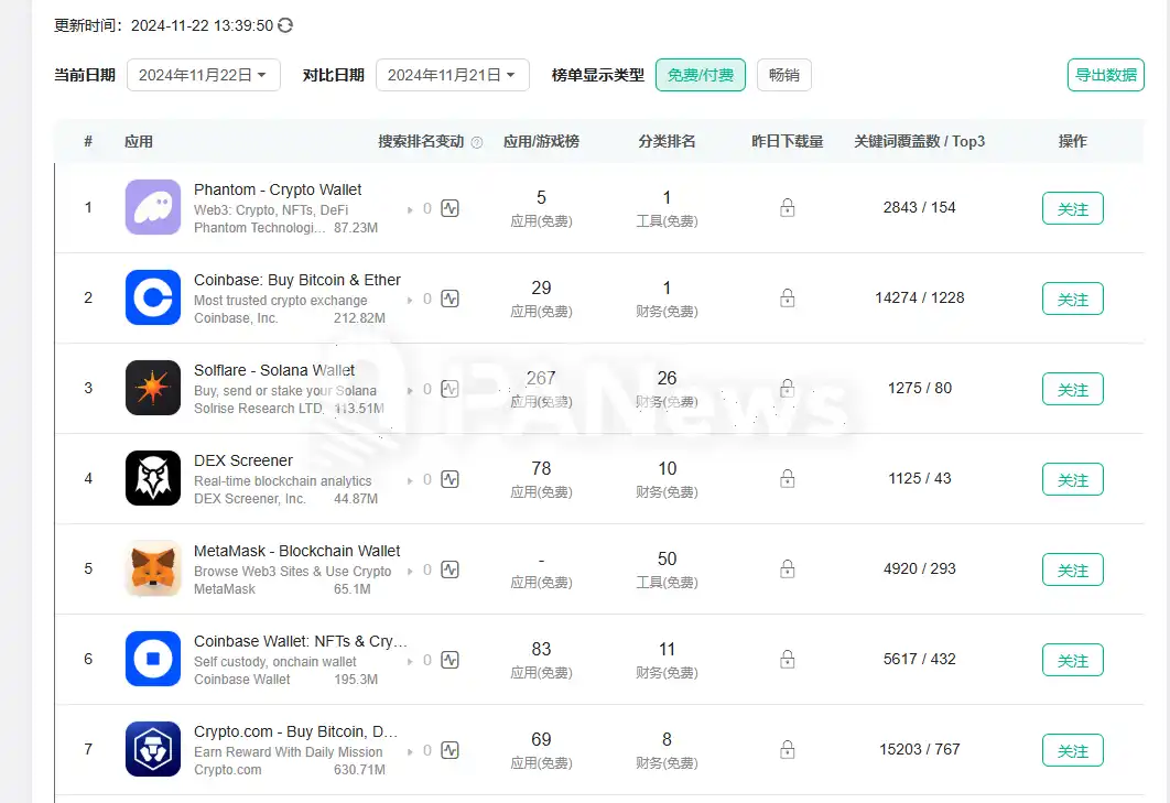 用 App Store 的增长数据来看,多数的加密类应用都有增长出现,除 Phantom 之外,Coinbase 近期的排名也上涨至最高总榜 29 名,财务榜第一。而其他的 Solflare、DEX Screener、MetaMask、 Crypto.com 都不同程度的增长,并进入数据榜前列。