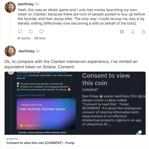 「正在比较 WC(Warpcast)和 SOL 的 Meme 币体验。有两个名为 CONSENT 的代币,最终只有一个会胜出。到目前为止的结果是:在 Clanker 上,会被大量的人抢跑和 rug;而在 pump.fun 上,至少开发者是真正的创始成员。例如,绝不可能用 Clanker 的模式为一个组织进行众筹。即使我在 pump.fun 上投入的金额只是 Clanker 的一小部分,但收益已经是在 Clanker 上损失的好几倍。我不确定这其中有多少是『正常的站点噪音(the normal site noise)』,又有多少是因为这个活动的加成,但对我来说,事实就是如此。」