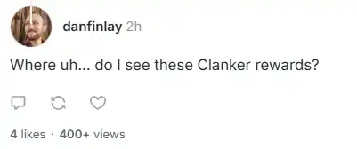 但 dan 似乎并未看到 X 平台的这篇帖子,但他收到了来自其他 Warpcast 用户的提示——「哪里可以看到这些 clanker 奖励(资金)。」