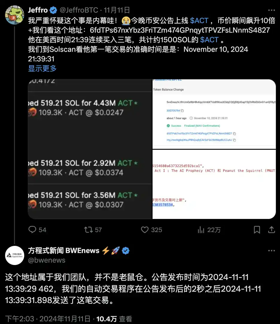 在每一个 CEX 发出公告后,我都会去研究看看有没有什么机会。研究这个公告的内容和新闻效应,然后不断地做复盘。后来也慢慢了解到了新闻交易,或者说现在比较流行叫消息面交易这种交易模式。比如大家都比较熟悉的方程式新闻,通过这种「新闻交易」从 ACT 获利了百万美金。当然方程式的交易方式需要一些科技,不是适合每个人去应用这种策略。所以我开始仔细的研究一些手动交易的机会,对我们没有什么科技的玩家比较友好。