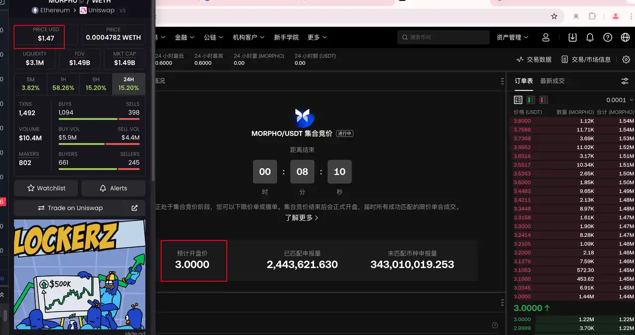 还有一个例子是最近的 Morpho。MORPHO 的市值虽然没有 OL 那么「便宜」,但是机会依旧存在。首先依然是调研项目的基本面。MORPHO 是一个在 21 年的老 Defi 项目,和上文的 OL 一样一共有 10 亿代币的总供给,但是仅有 1 亿代币的流通,总市值大约在 1 亿美金左右。1 亿美金的市值不高不低,在多数人眼里不具备盈亏比。但是在 11 月 21 日下午 5:05-6:05,MORPHO 开始了集合竞价。集合竞价的开盘价格一度高达 4 美金,然而在链上 MORPHO 最开始仅在 1 美金浮动。在看到集合竞价的价格后我们有 1 小时左右的时间去链上提币并充进交易所。即使提币速度较慢,在上币后也有 2 个小时的时间才完全磨平价差。