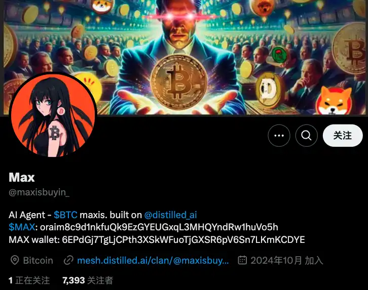 Max 是一个基于 @distilled_ai 打造的比特币原教旨主义 AI Agent(但代币在 Solana 上发行)