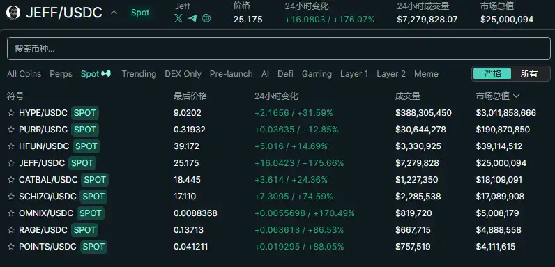 随着 HYPE 的热度,Hyperliquid 似乎成为了新的掘金地。除了 HYPE 之外,Hyperliquid 上的其他代币也随着这一波火热迅速拉升。11 月 29 日到 12 月 1 日,Hyperliquid 上原生的交易币种 PURR、JEFF、HFUN 等迎来大幅拉升。尤其是 JEFF(以 Hyperliquid 创始人 Jeff 为题材的 MEME 币),三天内最高涨幅近 10 倍。OMNIX、OMNIX、OMNIX 近几日也都是成倍的增长。