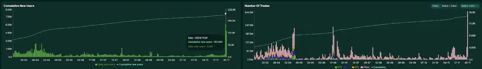 虽然在社交媒体的宣发并不多,但豪华空投的结果还是给 Hyperliquid 带来不少的新用户。从历史数据来看,在空投发布之前,Hyperliquid 的每日新增用户基本维持在 500 以下,多数情况下仅为 150 个新增用户左右,而在 11 月 29 日和 30 日两天,两天新增用户 10993 个,甚至超过过去 1 个月的新增用户数量。11 月 30 日,总交易笔数更是突破 344 万笔,较空投前增长 10 倍以上。