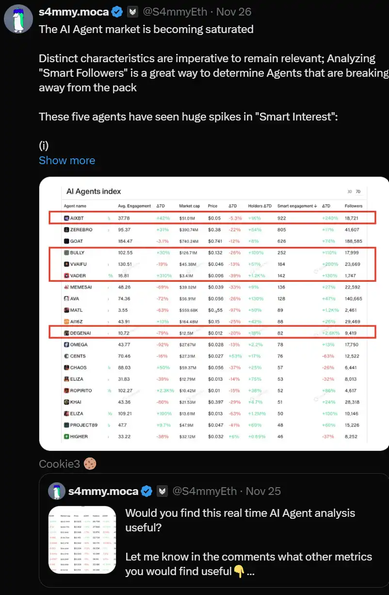 新的进展,例如 cookiedotfun AI 代理指数,使用户能够追踪新兴市场的参与者。