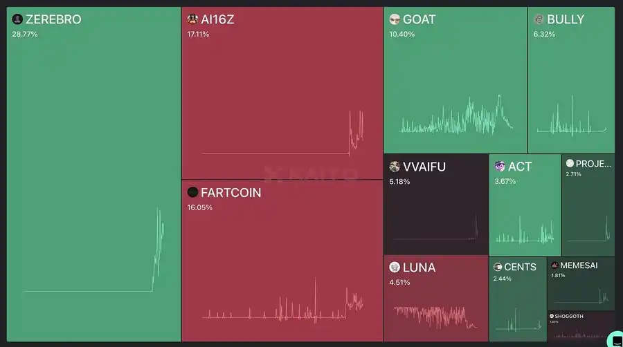 0xzerebro 在关注度上领先,但其市值仅为 GOAT 的一半,尽管其关注度高出 2.8 倍。