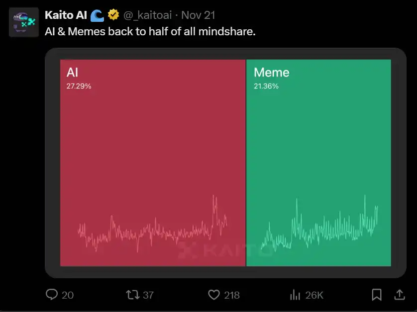 根据 kaitoai 的数据,加密推特上有 48% 的关注度集中在这两个领域。