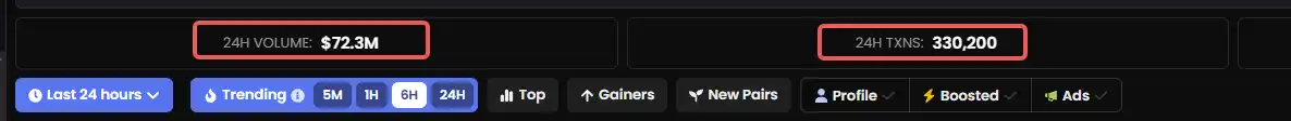 Dex Screener 数据显示,该生态内链上 24 小时交易量达到了 70M 以上,交易笔数来到了 33 万笔,晃眼一看还以为是 Solana。