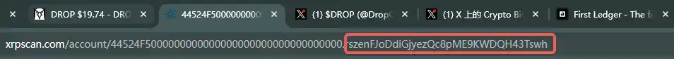 这里需要注意的是,XRP 生态中的代币地址基本都以重复的数字开头,最后小写打头的 r 字母开始才是代币的 CA;拿不准的玩家可以点击 Dex Screener 中的对应代币页面到 xrp 自己的浏览器 xrpscan,然后如下图所示的红框中复制出来即可找到 CA(对大小写敏感)。