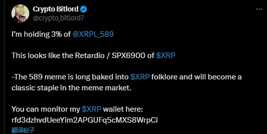 此外,知名 X 用户@crypto_bitlord7 公开表示自己持有 3% 的代币,并且给出了它的钱包以供监控: