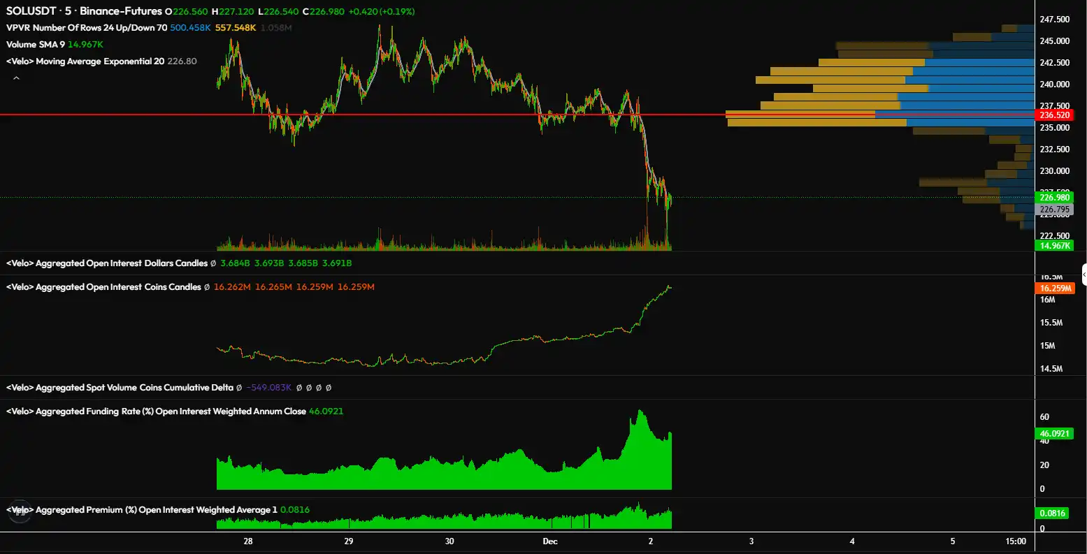 我在 ~$235-240 的位置开了空,并认为这是今年最后一个绝佳的非对称性机会。不过需要说明,我也对其他资产持有空头头寸(例如比特币,因为 Saylor 的买入价格与 ETF 之间的差距还在扩大;同时认为以太坊如果下跌,其下行趋势可能会延续得更久)。