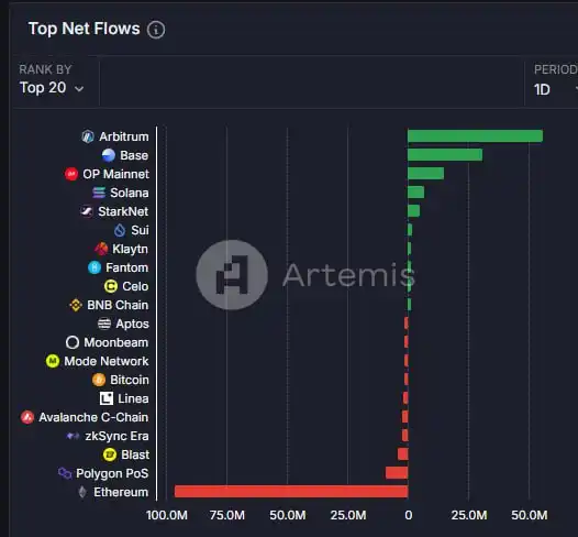 下图为 Artemis 流量数据,你可以选择按 1 周或 1 个月的时间范围进行观察。这是今年迄今为止 Solana 资金流量向 EVM 转移最显著的一次,这种转移不仅仅体现在流量上。我们还可以从热门领域案例中观察到,例如 AI 领域的 meme 币板块——此前被认为是顶尖项目的 GOAT、FARTCOIN、ZEREBRO 和 AI16Z,它们的估值在此期间均缩水一半,而 VIRTUAL 和代理生态系统却在同期蓬勃发展。