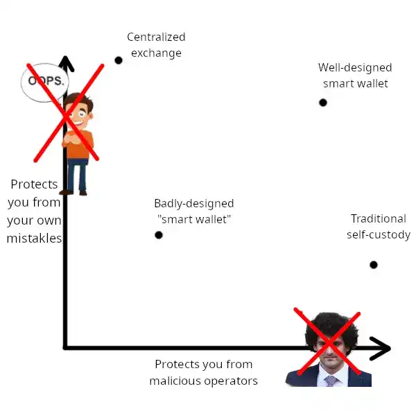 我对账户安全挑战的概念化的一种方式是,一个好的钱包应该同时在两个方面发挥作用: (i)保护用户免受钱包开发人员的黑客攻击或恶意攻击,以及(ii)保护用户免受自己的错误的影响。