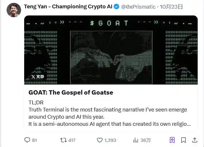 · Truth Terminal 等 AI 项目正通过$GOAT 等 Meme 币发展新型数字社区