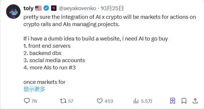 Truth Terminal 已经证明了 AI 代理在链上运作的可行性。这个领域的实验正在不断突破代理链上操作的边界,这一领域不仅潜力巨大,而且设计空间十分广阔。目前这已经成为加密和 AI 领域最具突破性和爆发力的方向之一,而这仅仅是开始。