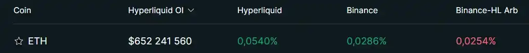 可以看到,Binance 的资金费率较低,其年化收益率为 31.2%(计算方法相同)。此外,Hyperliquid 和 Binance 之间存在套利机会。你可以在 Binance 上做多 ETH 永续合约,同时在 Hyperliquid 上做空 ETH 永续合约,从而获得 59.3% 和 31.2% 的年化收益率差额,即 28.1%。不过,这种策略也存在一些风险: