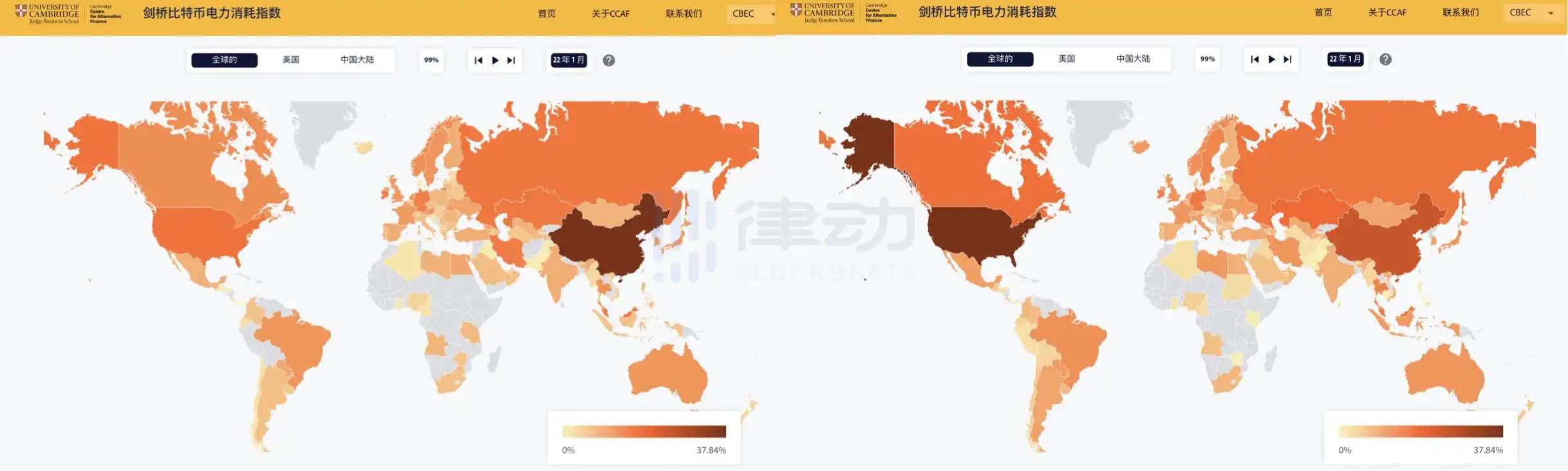 左图:2021 年 1 月;右图:2021 年 12 月。图源:剑桥比特币电力消耗指数