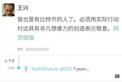 就在这个节点,美团创始人王兴在社交平台饭否上发文,表达了他对比特币的高度认可。作为 2013 年的早期投资者,王兴曾以极低的价格买入比特币,并将其视为一种「极富想象力的创造」。