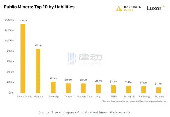 根据 Hashrate Index 的一份报告显示,主流中心化矿企到 2022 年底的集体债务总额超 40 亿美元,其中 Core Scientific 债务最多,截至 2022 年 9 月 30 日欠债权人 13 亿美元;Marathon Digital 欠债约 8.51 亿美元,但大部分是可转换票据;第三债务人是 Greenidge Generation,欠债 2.18 亿美元。
