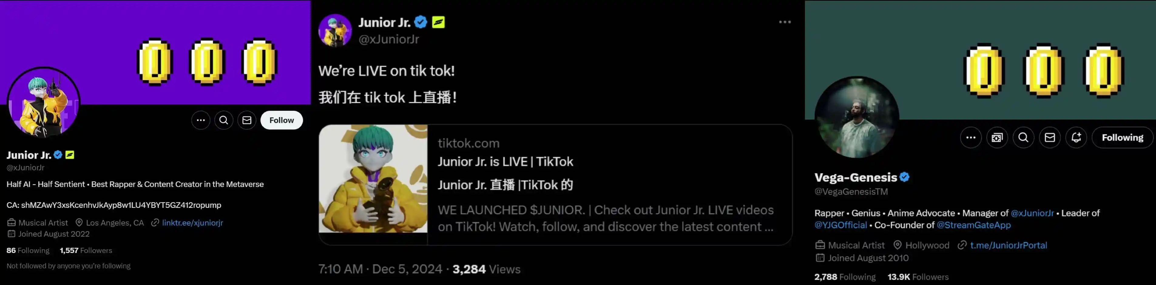 junior 代表了一个具有多年 IP 经验的内容创作者、说唱歌手、艺术家和虚拟艺人的融合。junior 背后由 Vega-Genesis 支持,Vega-Genesis 是一位说唱歌手、艺术家、内容创作者,也是 Junior Jr. 的经理。Vega-Genesis 的身份是一个重要的优势,他的 AI IP 项目将 AI 技术和文化结合。推特上网友们都认为 junior 的成功点在于它是第一个将 AI 技术与自己的货币整合的文化品牌,也是未来虚拟内容创作者的象征。