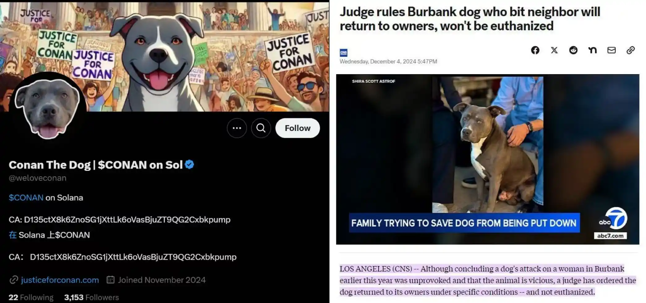 这一判象征着社区站出来反对政府过度干预并为那些无法发声的生物辩护,通过 conan 代币,支持者们不仅纪念这只成功免于安乐死的狗,也传递出为动物争取权益的信念,成为了一个象征拯救生命和倡导个人权利的标志。