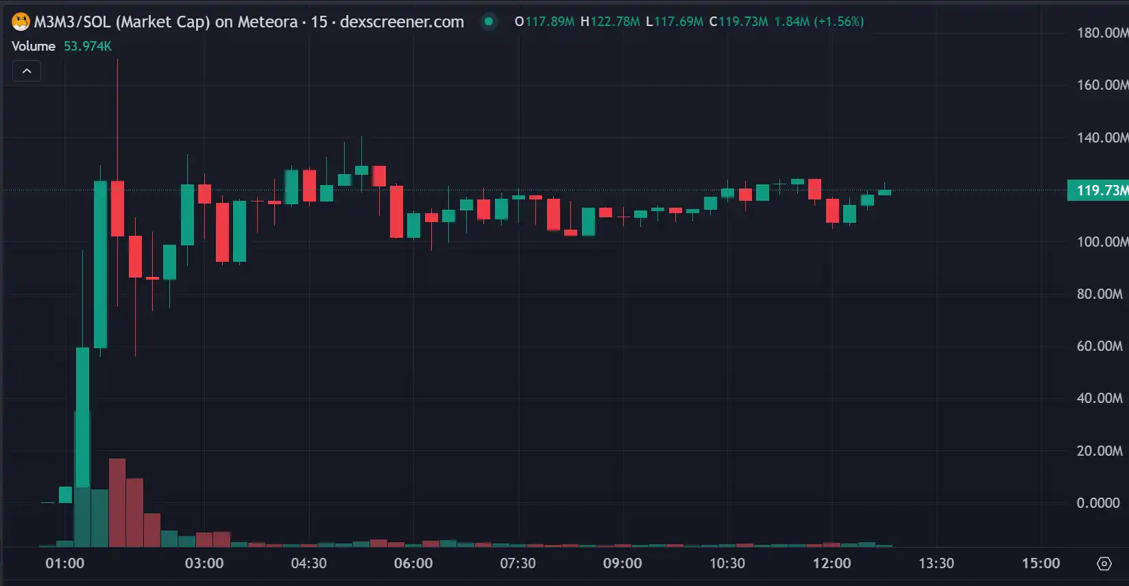 M3M3 上线后迅速拉升,最高市值达到 169.82M,目前是市值 200M 附近徘徊。