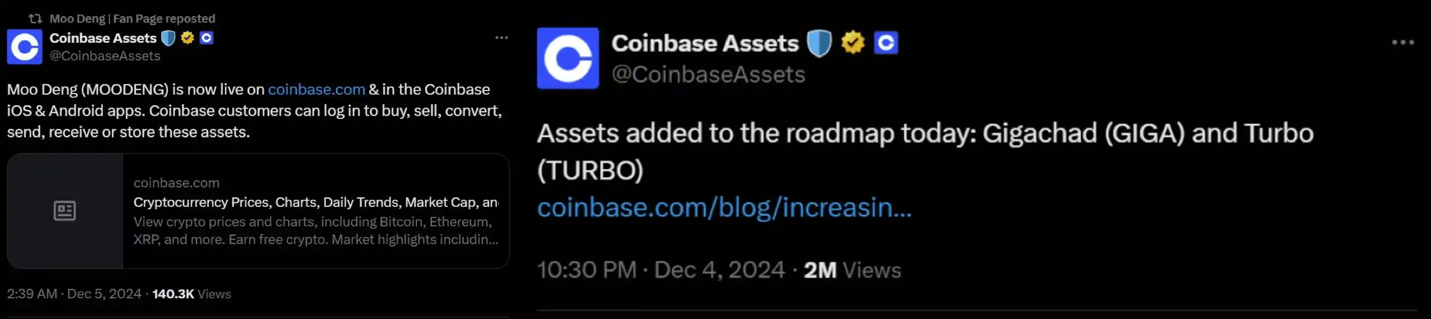 今天 solana 榜上的老牌 meme 出现了 MOODENG,GIGA 位于交易量的前三宝座上,MOODENG 这几天的交易量一直很大,一直位于榜前三,12.4 号晚上因为 Coinbase 发推特宣布上线 MOODENG 而迎来了一波回暖上涨 6 亿美元的市值。GIGA 也是在将近同时间突然爆拉至 7 亿美元,一个小时涨幅 71.4%,随后快速回调,GIGA 的这波爆拉是因为 Coinbase 发推特宣布将其加入到了项目的发展规划中。