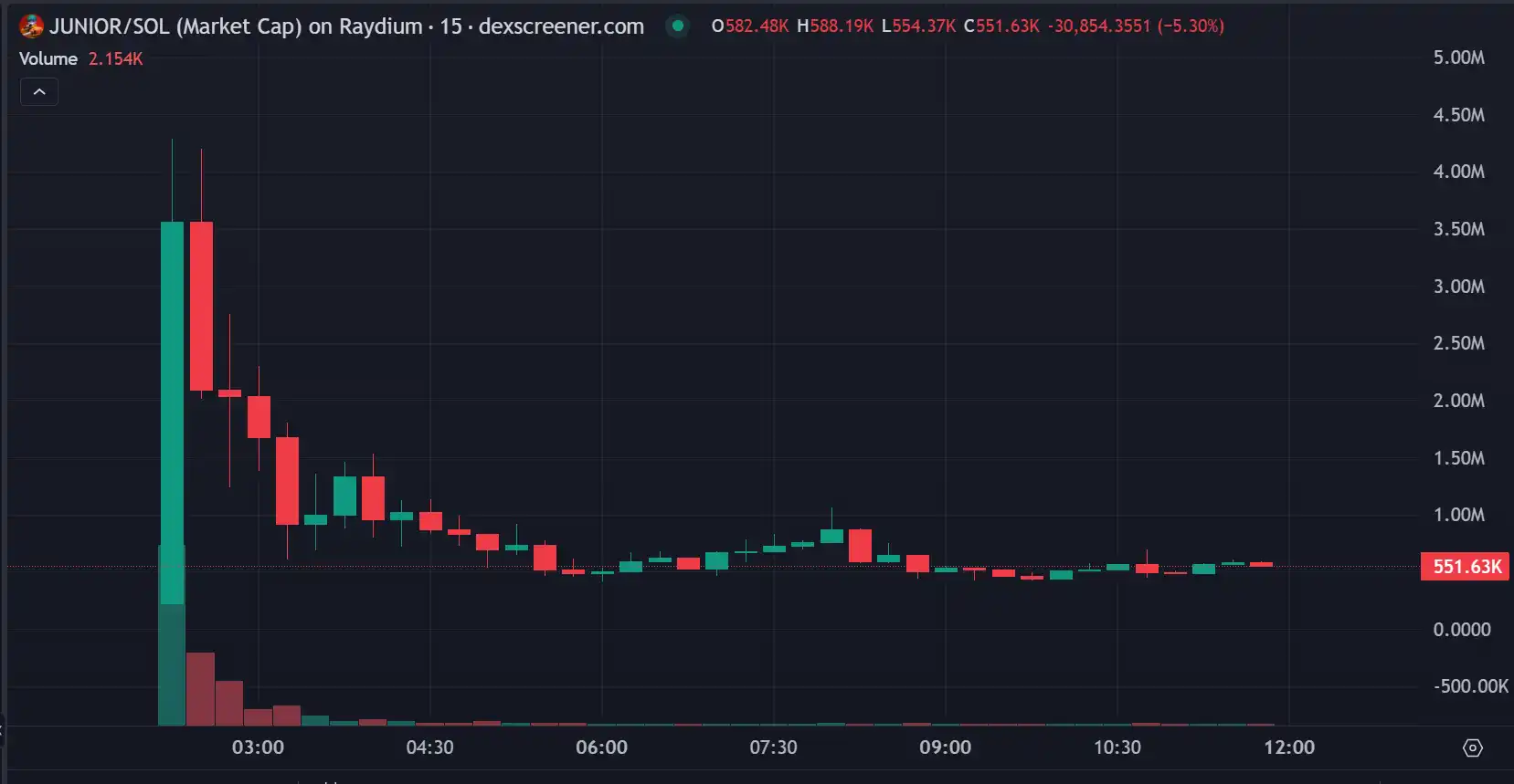 12.4 号晚上发币两个小时内市值爆拉 30 倍后震荡向上,今早九点达到最高市值 19M,在发币后的八个小时内市值拉伸 74 倍,目前又回到震荡状态。