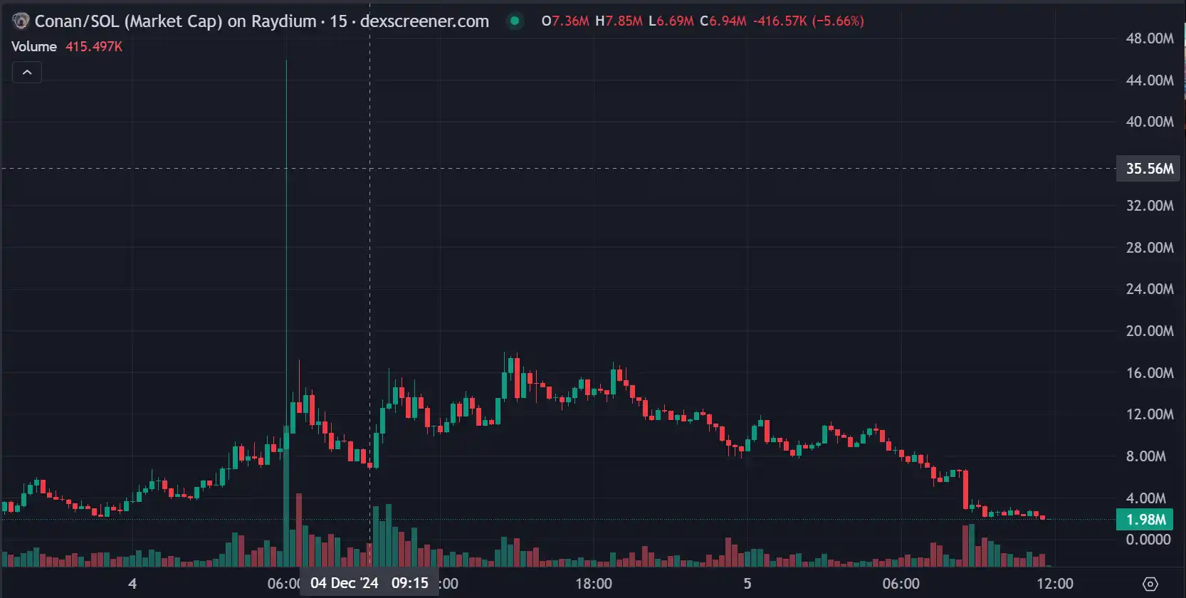 conan 在 12.4 号的早上六点突然向上拉伸五倍,达到最高市值 46.1M,然后迅速回调回 8M 附近进行一段了一段时间的震荡。