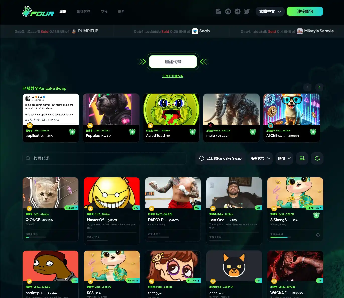 Four.meme 目前已在平台上列出超过 10440 种代币,其在 BNB 链上展现了极其丰富的广泛接受度和活跃度,其中已经有过百代币发射到了 PancakeSwap 上,例如$banana、$Aicell 等,展示出良好的市场表现和投资回报,而在最近大火的 desci 概念和 AI 项目上表现都很好。相关阅读:《背靠 BNB Chain,Four.meme 如何打造可持续的 meme 平台?》