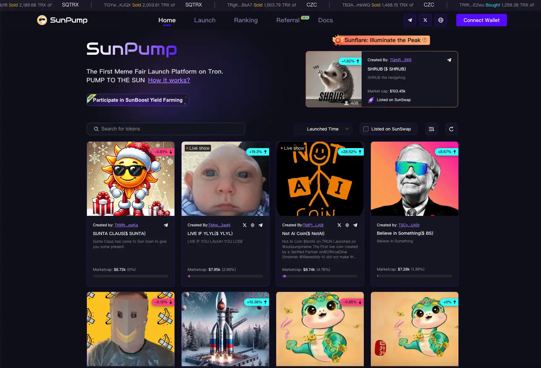 是 TRON 区块链上第一个专注于 Meme 币的启动平台,当任何代币项目的联合曲线达到 100% 资金目标时,流动性将自动注入到 SunSwap V2。这一机制避免了传统平台在预售期间常见的问题,如团队分配和高额费用,为用户提供了一个完全透明的代币管理和创建流程。