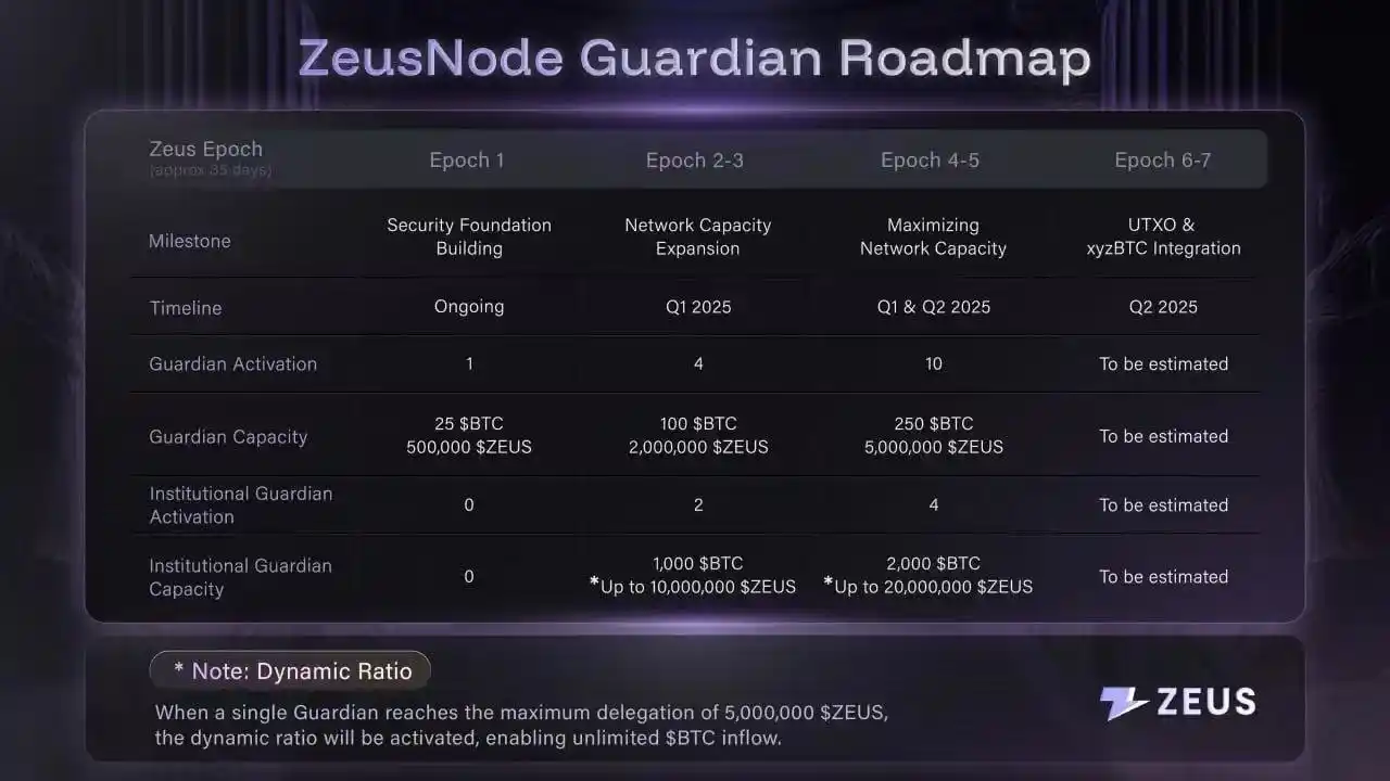 三名额外 Guardian 的激活以及 Institutional Guardians 的引入将增强能力。在机构比特币流动性增加的支持下,这一扩张预计将有 1,100 $BTC。因此,网络的容量将大幅增长,支持多达 12,000,000 $ZEUS 的委派。