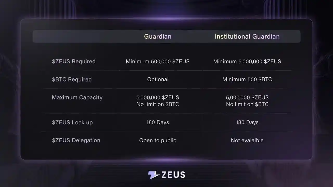 在初期阶段,ZeusNode 计划接纳最多 10 个 Guardian 和若干 Institutional Guardians,以确保网络的安全性和可扩展性。请阅读以下内容,进一步了解每种 Guardian 类型。