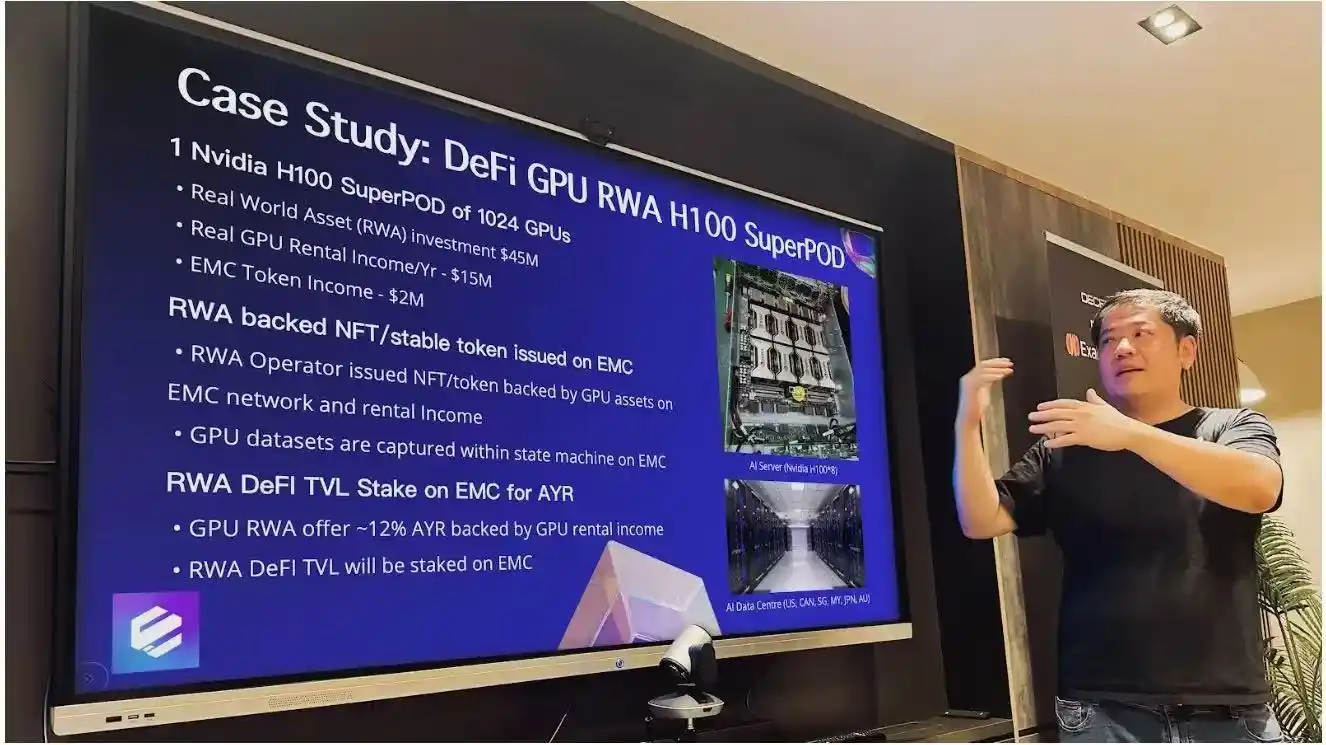 但这还不是最让人兴奋的部分。通过将这些 GPU 算力资源整合到 去中心化平台 中,EMC 提出了将这些高性能硬件 通证化 的构想。也就是说,全球的投资者和开发者可以通过 区块链技术,将这些计算资源 分解为小单元,使得 GPU 算力 变成一种 可交易的资产。这样一来,任何人都能在 EMC 平台上 购买、质押 这些 GPU 算力,获得 约 12% 的年收益率(AYR),并且直接参与到 AI 计算的浪潮中。