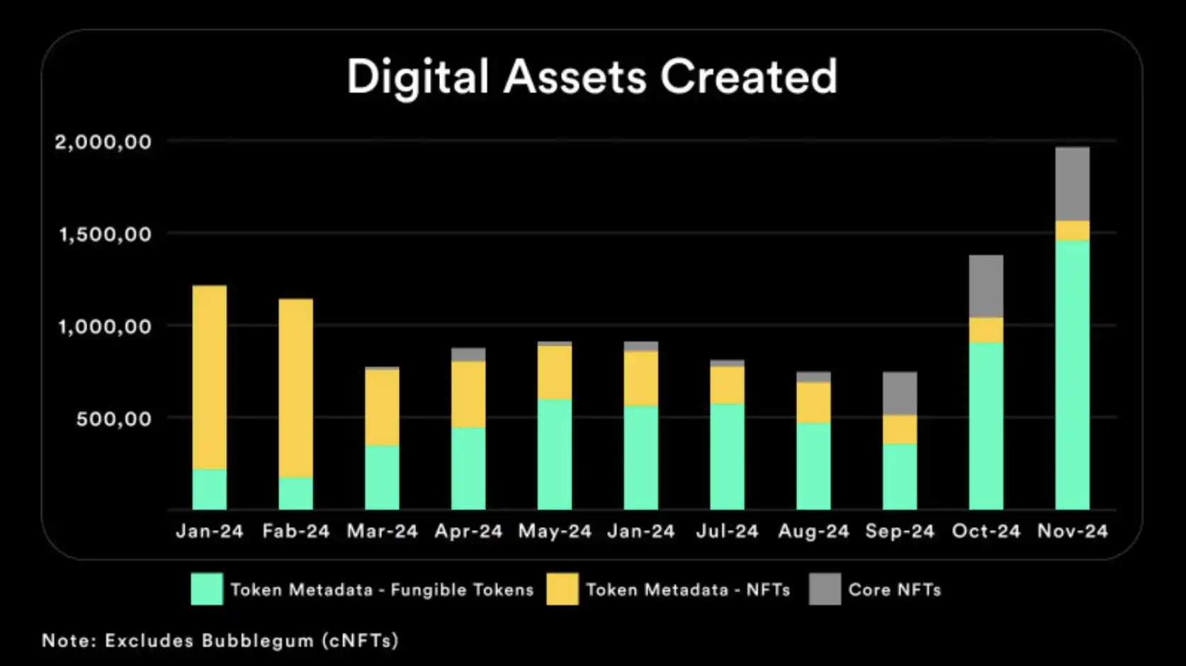Metaplex 是 Solana 网络上几乎所有代币、memecoin 和 NFT 的底层区块链协议,在 2024 年 11 月创下了历史最高的协议费用纪录,这得益于 Solana 网络上数字资产创建的显著增长。