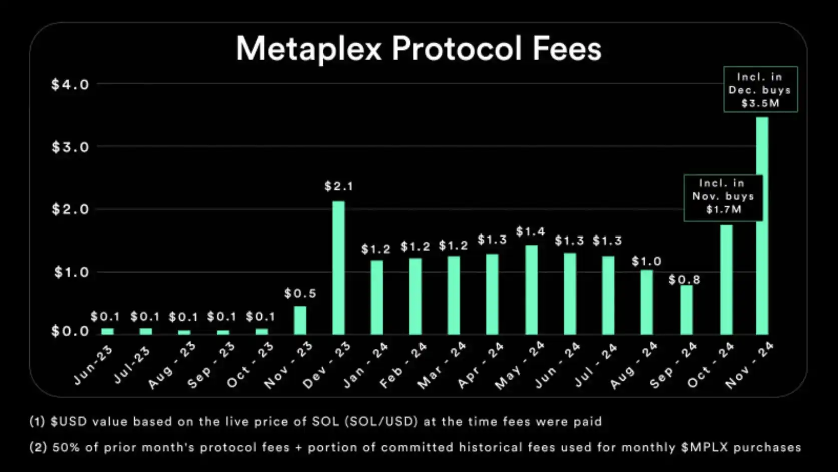 借助这一势头,Metaplex 11 月的协议费用达到了 350 万美元的历史新高,为 12 月的 $ MPLX 购买分配奠定了坚实基础。