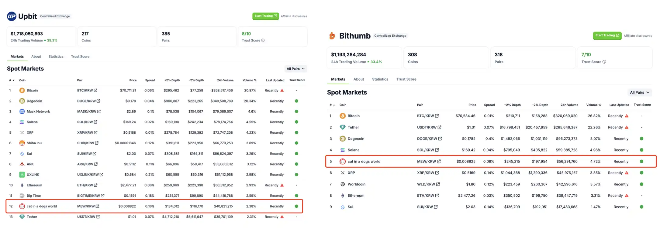 MEW 的 CEX 交易情况|左:Upbit 排名第十二;右:Bithumb 排名第五