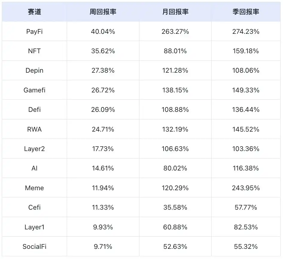 按周回报率统计,PayFi 赛道表现最佳,而 SocialFi 赛道表现最差。