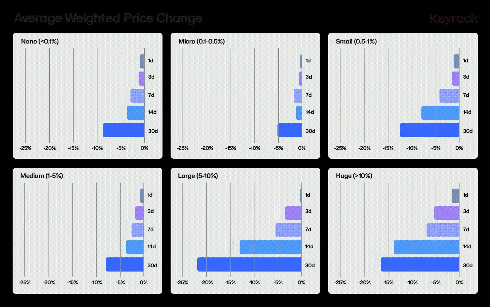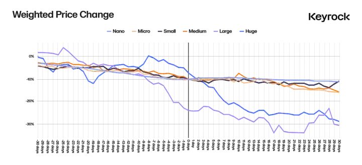 有趣的是,数据显示,巨额解锁(> 10% 的供应量)的表现与大型解锁(5%–10%)一样好甚至更好。这可能是因为由于解锁规模太大而无法完全对冲,并且无法在 30 天内抛售或解除。因此,它们的市场效应往往更加渐进和持久。