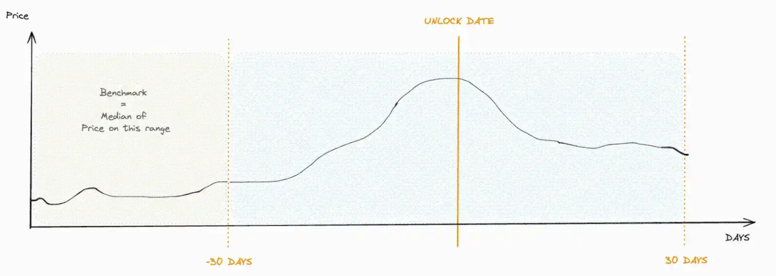 所以这些解释了为什么价格如此负面,但为什么在前 30 天也观察到价格下跌?这在很大程度上可能是严重的价格影响和重叠的线性解锁的结合。为什么在观察之前试图控制中位数价格,因为许多解锁都是连续的,数据仍然显示存在抑制。在这方面,如果你尽最大努力,不仅要跳过批量 Cliffs 解锁,还要在解锁的线性期内推迟购买。