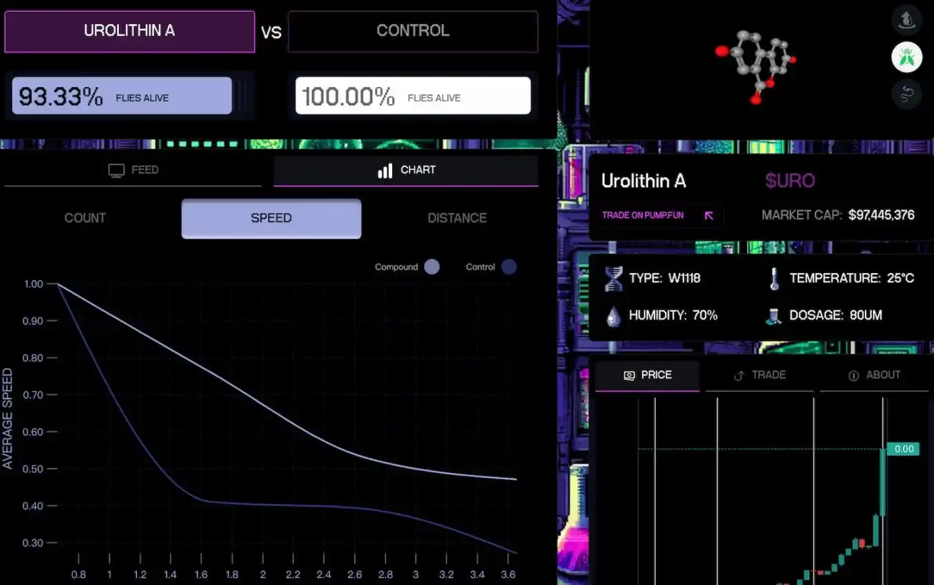 当前在 pump.science 上仅有两项实验,利福平 Rifampicin(RIF)和尿石素 A Urolithin A(URO),且均处于果蝇测试阶段,市值分别为 1.9 亿美元和 9700 万美元。两项实验的完成进度均为 2.74%。