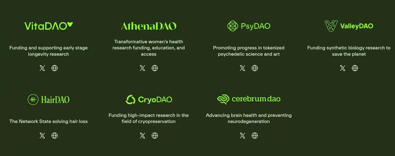 · VitaDAO(代币 VITA,1.3 亿美元市值):详见《DeSci 淘金|龙头 VitaDAO:如何引领长寿研究?》。