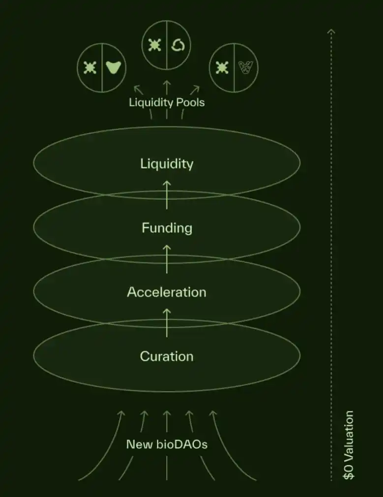 BIO 生态系统则是由多个 BioDAO 组成的网络,每个 BioDAO 专门开发特定科学领域的研究和产品。