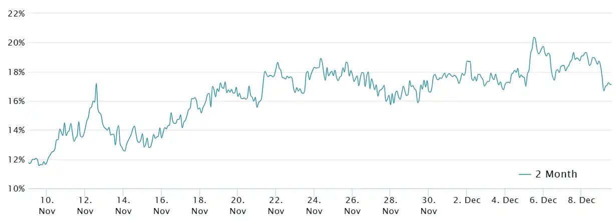 以太坊期货的年化溢价维持在 17%,远高于 10% 的中性水平,显示出对 ETH 杠杆需求的持续热度。