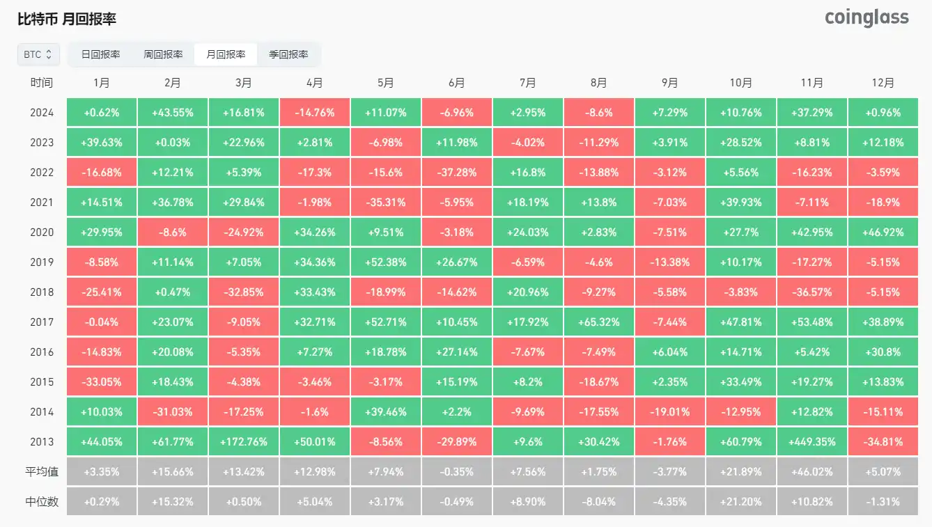 根据 CoinGlass 数据,比特币在过去 12 年中,12 月份与 1 月份的上涨概率均为一半。这一历史数据表明,年末和年初的加密市场总体表现较为平淡,波动性增加的同时,趋势并不明确。未来投资者需更加关注市场数据、宏观环境以及杠杆头寸的动态变化,在布局时做好风险管理,为长期投资策略提供支持。