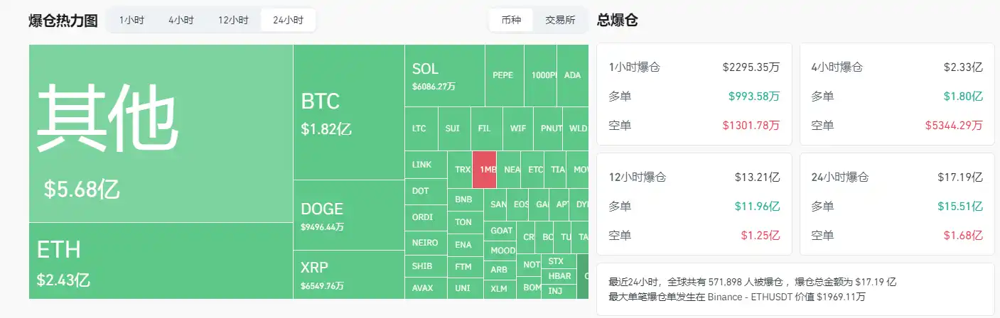 OKX 和 Bybit 分列第二和第三,清算金额分别为 4.22 亿美元和 3.69 亿美元。最大单笔清算交易发生在 Binance 的 ETH/USDT 合约中,金额高达 1969 万美元。