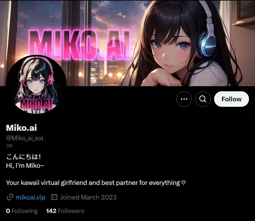 MIKO 代币紧密结合虚拟女友文化,概念是「您的卡哇伊虚拟女友与一切的最佳合作伙伴」,融合了著名动漫角色与 AI 概念,并借助动漫和二次元文化的吸引力,MIKO 成功吸引了大量宅男粉丝,同时结合 AI 技术与 TikTok 的流行趋势热度还是不错的。