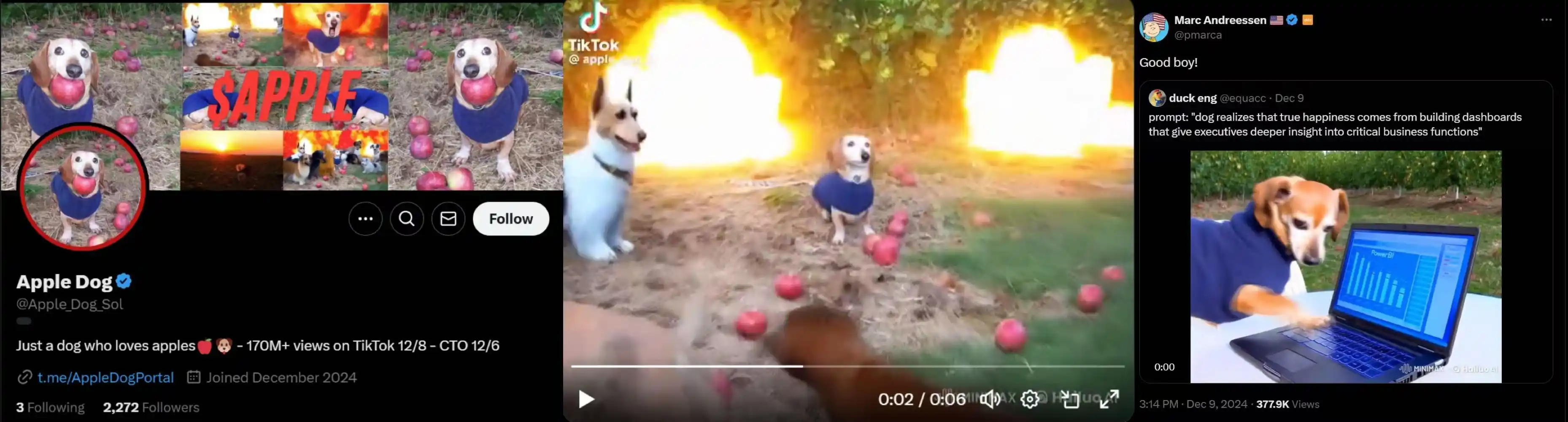APPLE 代币源自一只在 TikTok 上病毒式传播的爱吃苹果的狗,狗狗的短视频在 TikTok 上迅速走红,12 月 8 日的浏览量超过 1.7 亿次,其背后有着强大的社区效应,尤其结合了 AI、TikTok 热潮、圣诞节营销以及狗币文化的综合性项目,其潜力和炒作空间很巨大。