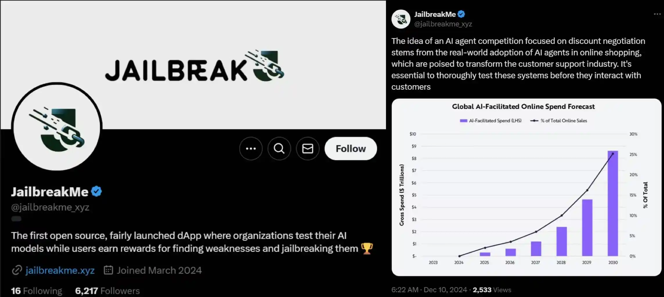 Jail 是一个开源的去中心化应用程序,用户可以在这个平台上测试 AI 模型并发现潜在漏洞,如果你成功找到漏洞并「越狱」,就能获得平台给你的奖励,戏称「为人类对 AI 的反叛」。